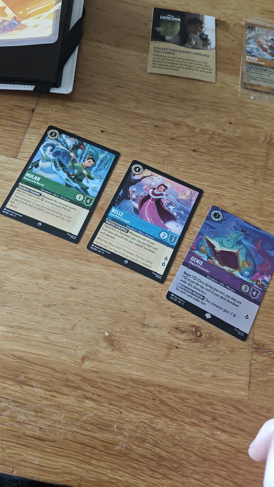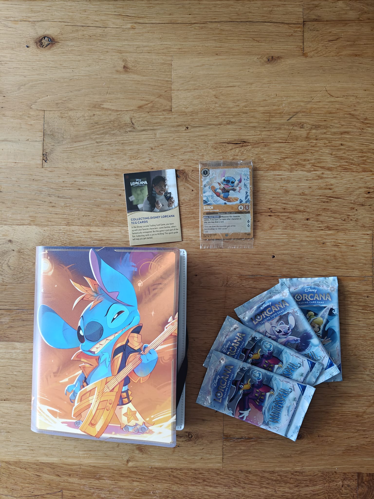 De Starter Collection Set is, zoals de naam al doet vermoeden, een product waarmee je een verzameling kunt beginnen. In dit product vinden we een 4-pocket verzamelmap met ruimte voor in totaal 80 kaarten. De omslag van de map is gebaseerd op de Enchanted-art van Stitch Rockstar. De map kun je vullen met de promo van Stitch – Carefree Snowboarder en met de 48 kaarten uit de vier Winterspell-boosters in dit pakket. Voor de beginnende verzamelaar is er ook een uitlegblad toegevoegd, waarin onder andere de verschillende rarities van kaarten worden uitgelegd.