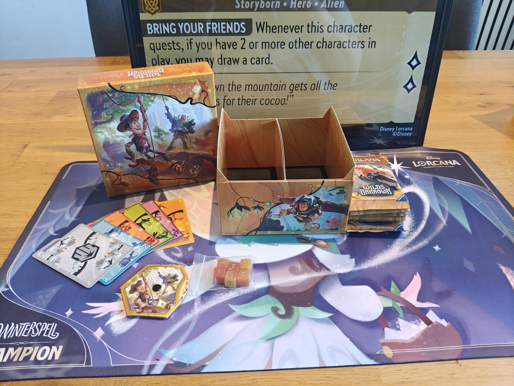 We hadden ook geluk met onze trove, waar 8 boosters in zaten naast de bekende lorecounter, dobbelstenen en kaartdividers. Uit de 8 pakjes trokken we één epic en een Merida - Formidable Archer. Uit de trove haalden we ook de kaart die we vorige week mochten onthullen.